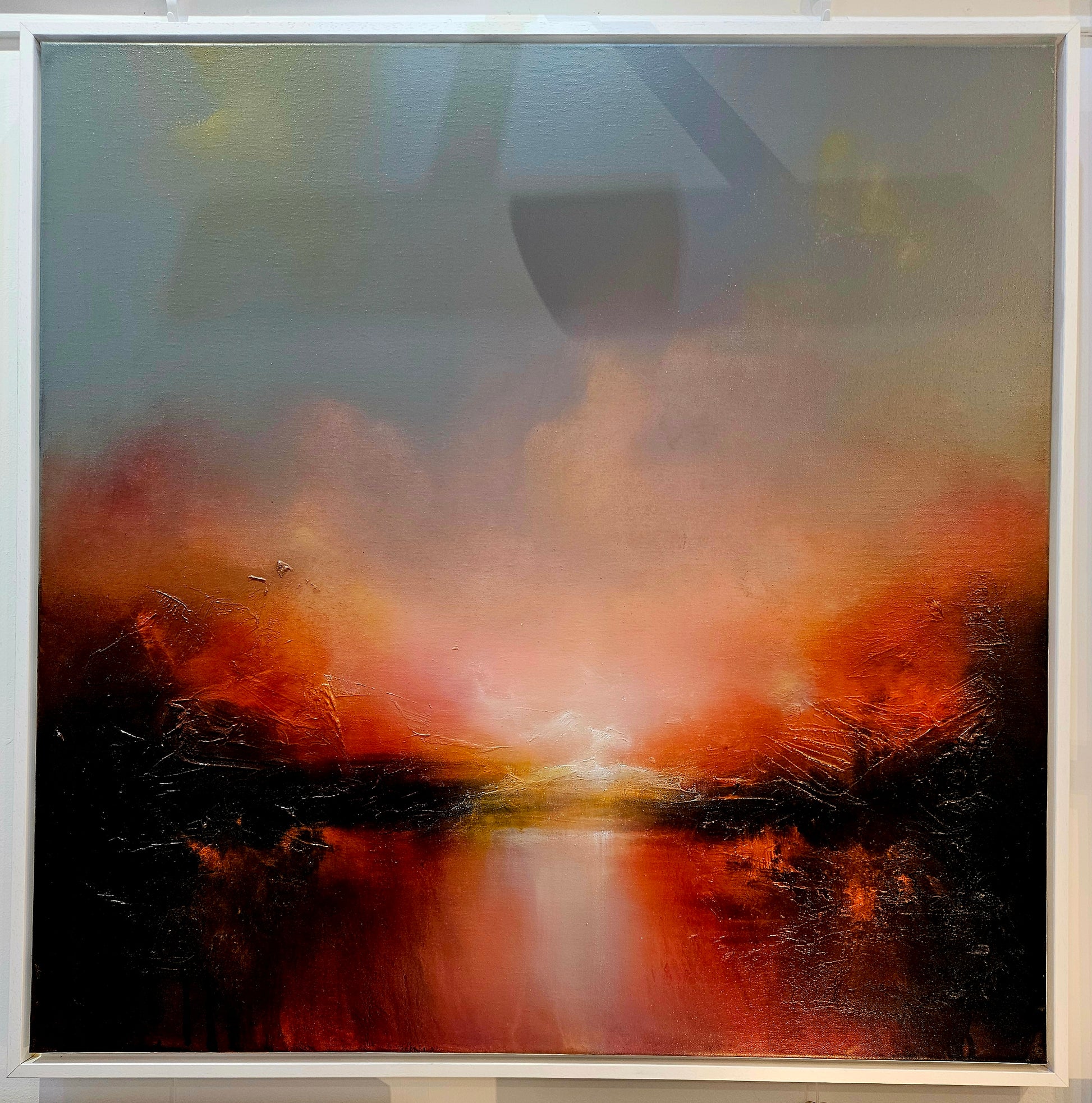 This painting features an abstract landscape with a dramatic and atmospheric feel. The composition is dominated by warm tones of red, orange, and yellow, creating a fiery effect that is reminiscent of a sunset or sunrise. These colors blend into cooler shades of gray and blue at the top of the painting, suggesting a sky transitioning from day to night or vice versa.