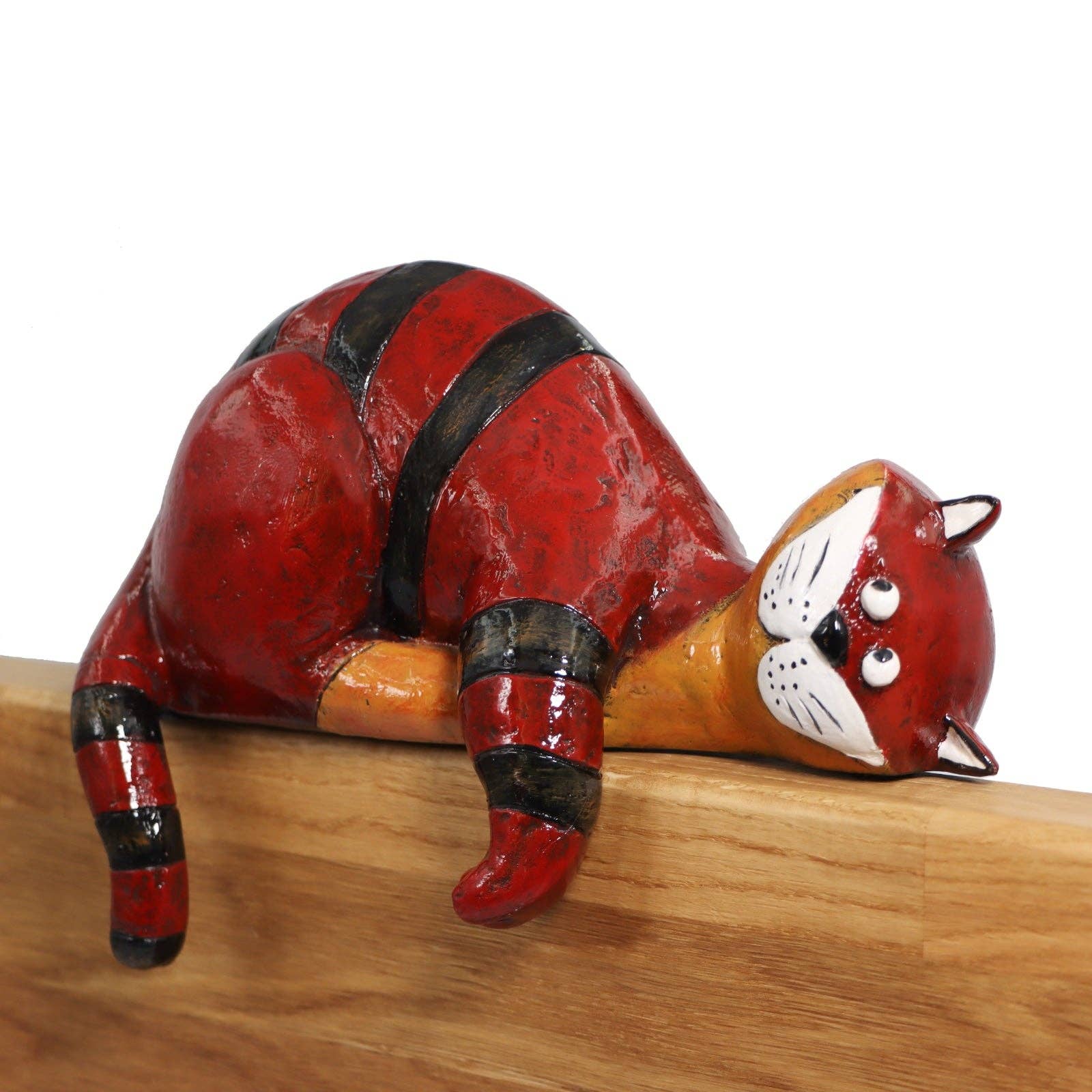 The Lazy Cat sits on the edge of a shelf or window cill with leg and tail dangling over the edge.