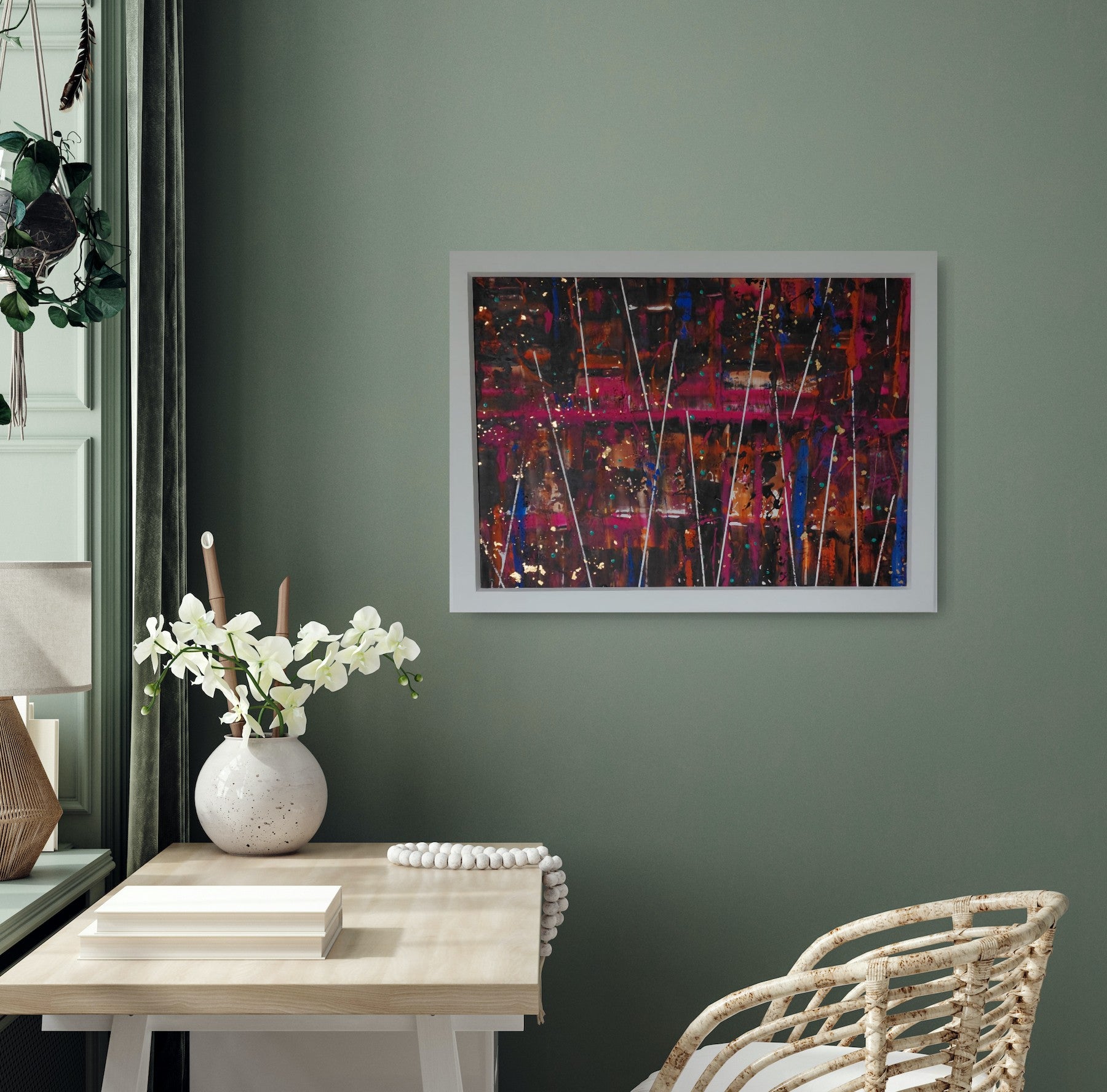 The painting is an abstract composition with a rich and dynamic use of colours and textures. It features a dark background with prominent splashes and strokes of vibrant colors such as magenta, orange, blue, and black. There are vertical white lines intersecting the canvas, creating a sense of structure amid the chaotic backdrop.