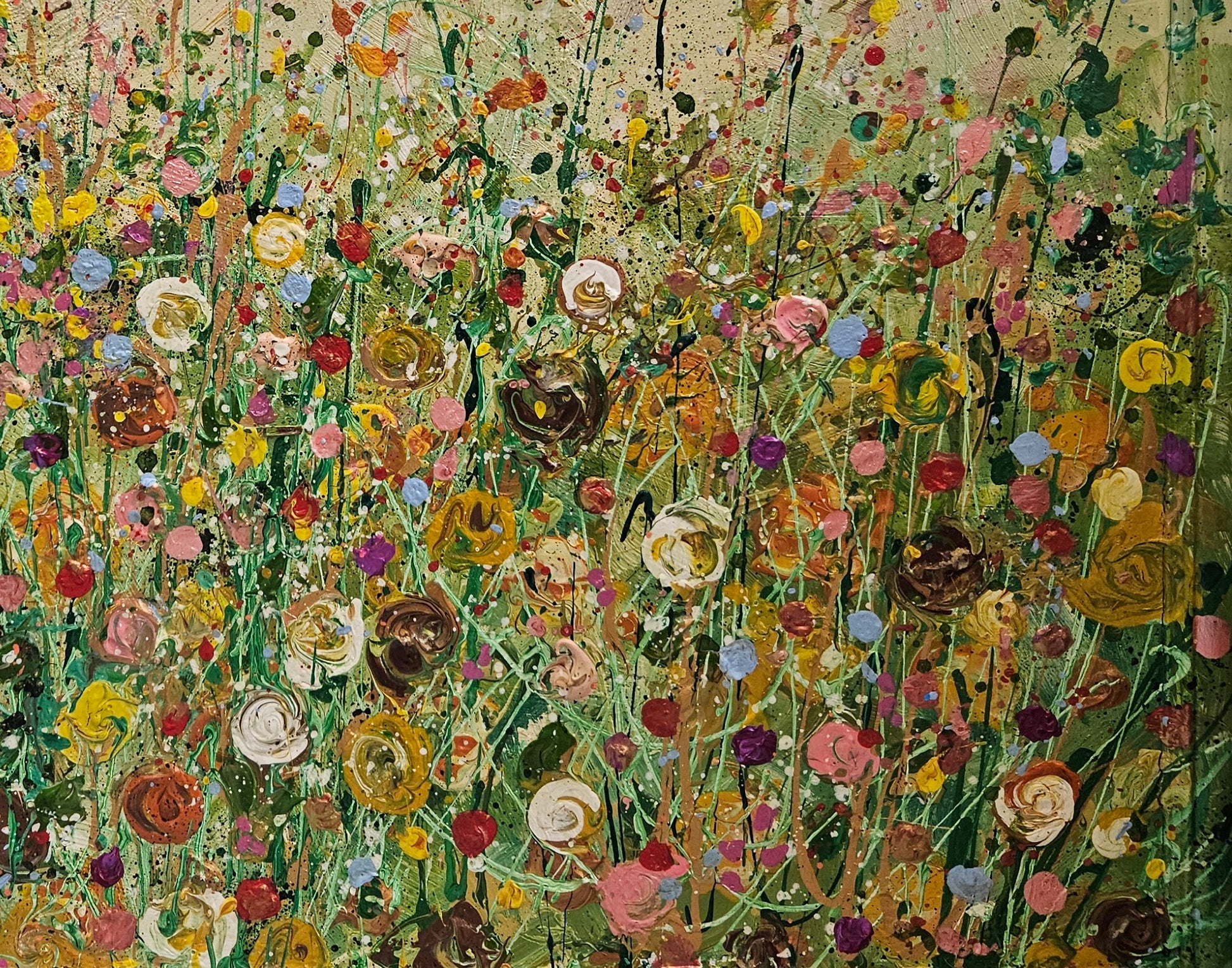 Impasto acrylic artwork by Zoe Taylor, using acrylics paints to build up to create a textured flower field. The whole of the front of the frame is incoporated in the artwork.