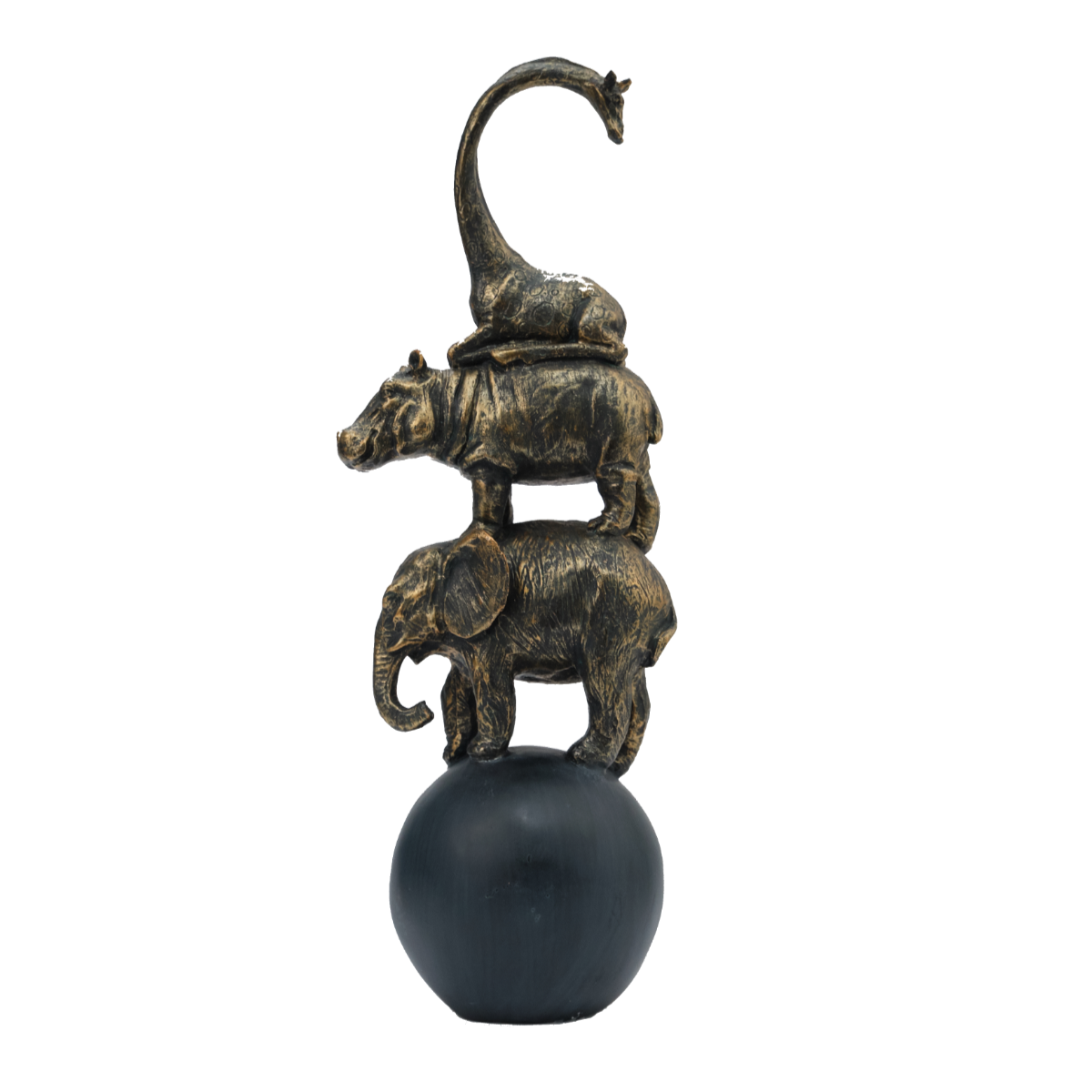 Product details: Dimensions: H 42 cm, W 15 cm, D 12 cm Poly-resin sculpture in a Bronze coloured finish. A Poly-resin sculpture in a Bronze coloured finish of an Elephant, Giraffe, and a hippo balancing on a black sphere. This item has a height of 42 cm, a width of 15 cm, and a depth of 12 cm.