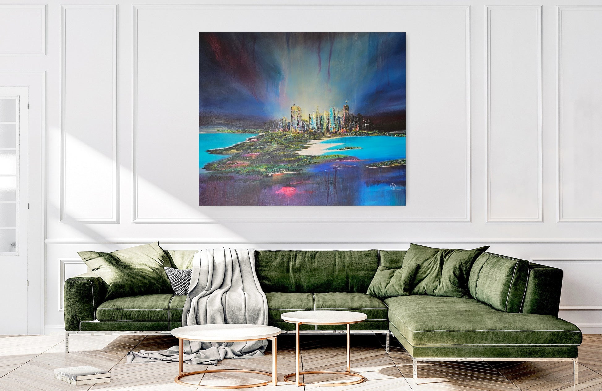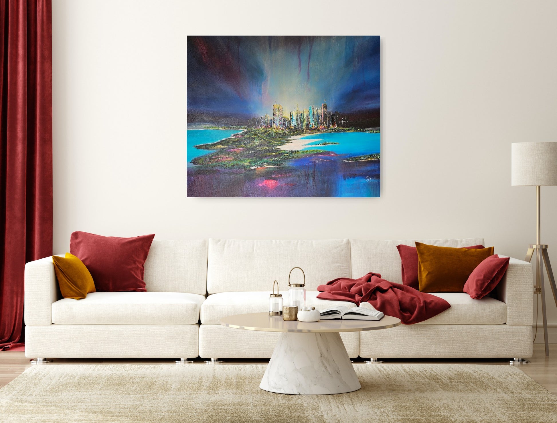 Description: The painting is a vibrant and abstract painting of a cityscape. The city is depicted with tall, colorful skyscrapers that are illuminated against a vivid blue and purple sky. The skyline is surrounded by a body of water, with various shades of blue, and the land appears lush and green, possibly indicating a combination of urban and natural elements. The colors are bright and blend into each other, giving the painting a dynamic and surreal feel. There are also some areas of white, which may represent reflections or the shoreline. Overall, the painting conveys a sense of energy and modernity